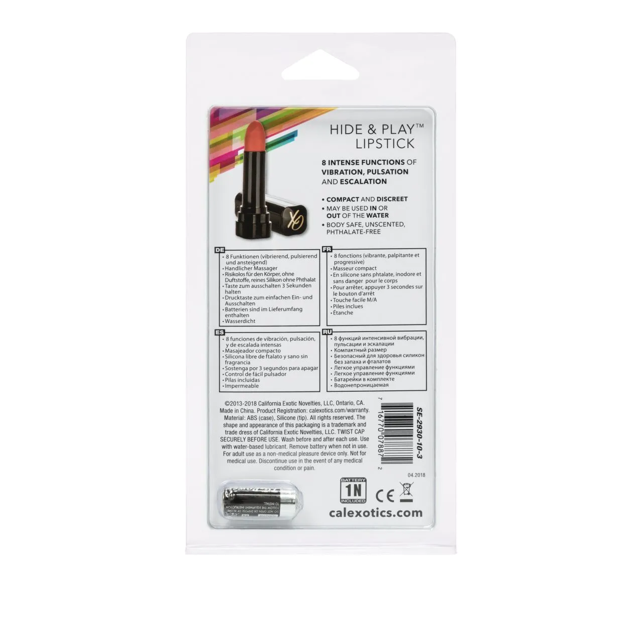 Hide & Play Lipstick – миниатюрный вибромассажер, выполненный в виде простой помады. Корпус изготовлен из гладкого, не содержащего фталатов АБС-пластика, покрытого атласным полеуретановым покрытием, а головка выполнена из гипоалергенного силикона. Мощный мотор обеспечивает мультискоростную вибрацию.