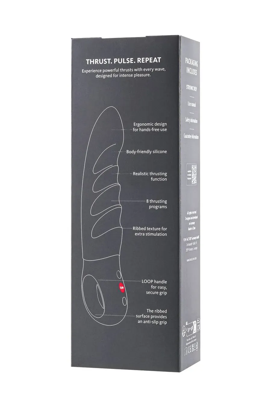 Погрузитесь в волны чистого удовольствия, подпитываемые реалистичной функцией поступательных движений! STRONIC DEEP обеспечивает мощные, глубокие поступательные движения – и все это без помощи рук благодаря эргономичному дизайну. Ритмичные движения вперед-назад имитируют реальную жизнь и обеспечивают реалистичные ощущения с каждым импульсом. При этом чувственная ребристая текстура и впечатляющая длина 21 см создают глубоко удовлетворяющие ощущения, а изогнутый кончик точно воздействует на точку G, приглашая вас исследовать новые уровни интенсивности.