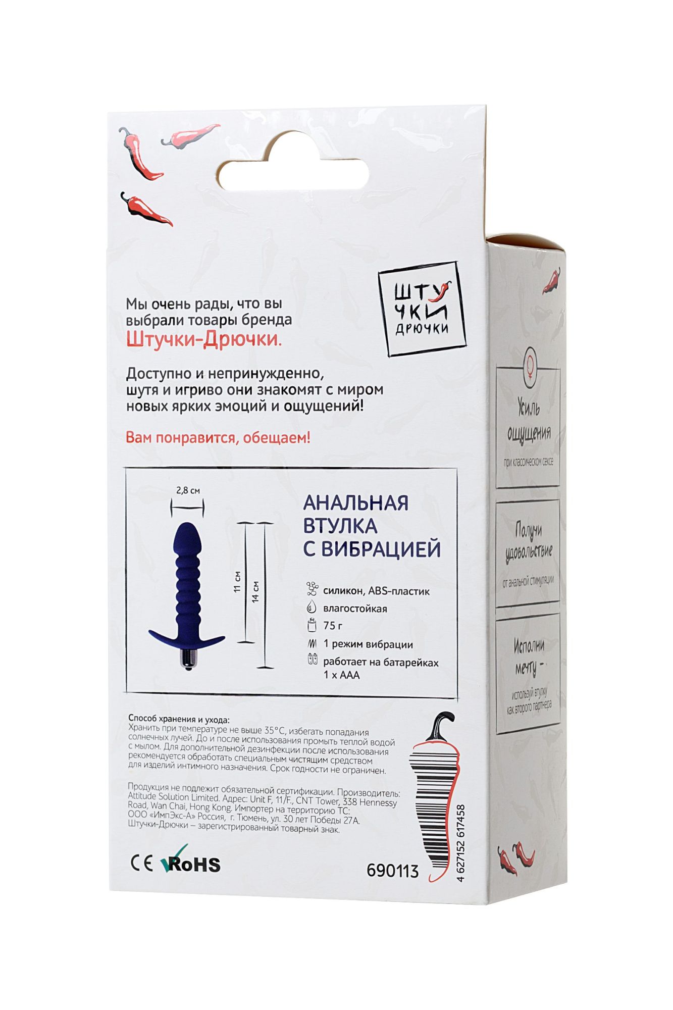 Виброштучка для анальной стимуляции от бренда «Штучки-Дрючки»: Новый опыт в сексе Мощный оргазм при классическом сексе Массаж простаты у мужчин Средний размер (14 см) и бархатистая силиконовая поверхность подойдут даже самым-самым смущающимся и пугающимся новичкам: это обеспечивает комфортное проникновение и деликатную стимуляцию. ⠀ Необычный рельеф и зауженный кончик позволяют подготовиться к самому процессу: постепенное введение втулки дарит только приятные ощущения. ⠀ Вибрация не только расслабляет мышцы, но и приносит дополнительное удовольствие, как при одиночной стимуляции, так и во время классического секса с партнёром. Для чего нужна: Для анальной стимуляции, для безопасного знакомства с анальным сексом, для дополнительного удовольствия при классическом сексе, для массажа простаты у мужчин. Просто ухаживать, использовать с лубрикантами на водной основе и мыть тёплой водой с мылом.