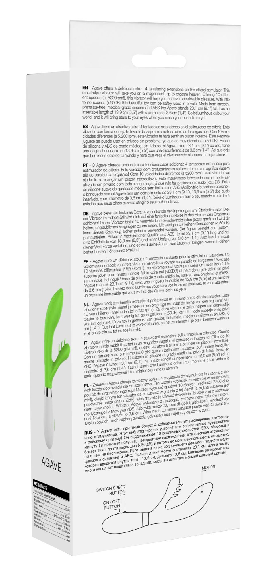 Вибратор - кролик Agave имеет округлую утолщённую головку и гибкий клиторальный отросток, что делает стимуляцию более яркой. Вибромассажер имеет два мощных двигателя, по одному в каждом отростке, имеющих 10 функций вибрации, способной достигать на вагинальном стволе 15000 и на клиторальном отростке 5200 оборотов в минуту, при этом уровень звука не превышает 50 дБ.