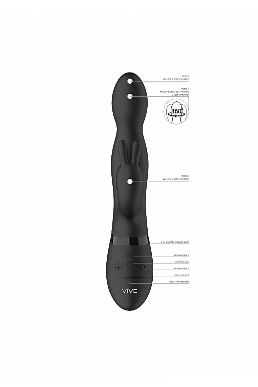 Вибромассажер подходит для вагинально-клиторальной стимуляции. Функция «мгновенный оргазм» дает возможность получения быстрого и/или очень сильного удовольствия. Благодаря ротации на 360 градусов идеально подходит для стимуляции внутренних эрогенных зон, в сочетании с клиторальной стимуляцией.