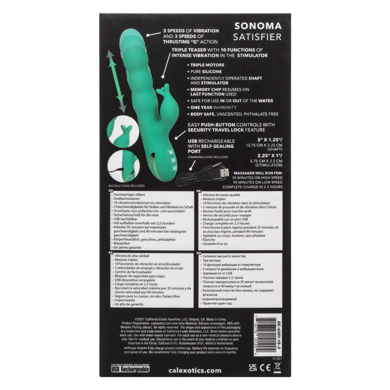 Вибромассажер SONOMA SATISFIER – перезаряжаемый мульти скоростной вибратор кролик из бесшовного материала с дополнительной обработкой. Вагинальный отросток у этой модели имеет волнистую форму и 3 функции «интенсивное поступательное воздействие». Клиторальный отросток с тремя лепестками на кончике имеет отдельный мощный виброэлемент, обеспечивающий 10 режимов интенсивной вибрации.