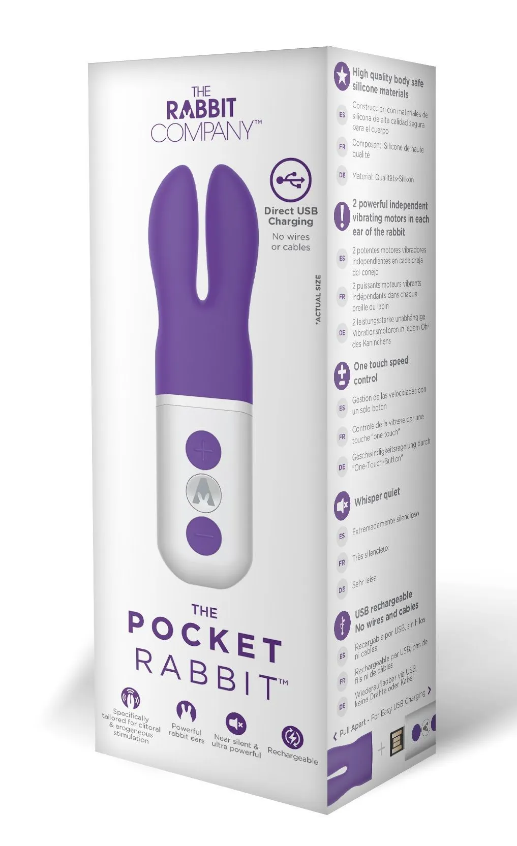The Pocket Rabbit - это клиторальный мини-вибратор от компании The Rabbit Company, изготовленный из высококачественного и бесшовного медицинского силикона. Вибратор оснащен двумя мощными независимыми двигателями, которые отвечают за шесть бесшумных функций вибрации и пульсации. Специальный кончик в виде ушек обхватит Ваш клитор, дразня и щекоча его, пока Вы не достигните самого сладкого мгновенья! Такую компактную интимную игрушку удобно брать с собой в дорогу и получать удовольствие в любое время. Также The Pocket Rabbit может стать прекрасным подарком для близкого человека!