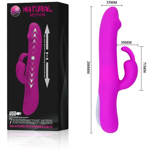 Изящный вибратор отличается гибким клиторальным отростком в виде зайчика с шаловливыми ушками, который в процессе стимуляции доведет свою хозяйку до высшей точки наслаждения. Изделие имеет гладкую поверхность, 7 режимов вибрации и 7 режимов фрикций. Режимы регулируются сенсорными кнопками в основании игрушки. Материал - силикон. Длина изделия – 20,5 см, рабочая длина - 12 см, диаметр – 3,4 см, длина отростка — 6,5 см, диаметр- 2 см. Работает от USB провода (есть в комплекте). Упаковка: картонная коробка с принтом.