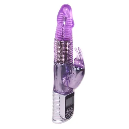 Вибратор Хай-тек с функцией вращения ствола и клиторальным стимулятором в виде кролика. Режимы вибрациии и режимы вращения можно совмещать. Мягкий, имеет ярко выраженную головку и ребристость. Материал изготовления- ТРЕ (гель). Имеет 9 режимов вибрации и ротации. Работает от 4-х батареек типа ААА (нет в комплекте). Общая длина 26,5 см, рабочая длина 14 см, максимальный диаметр 4 см, длина клиторального стимулятора 6 см, диаметр 3,5 см. Упаковка- прозрачный пластик.