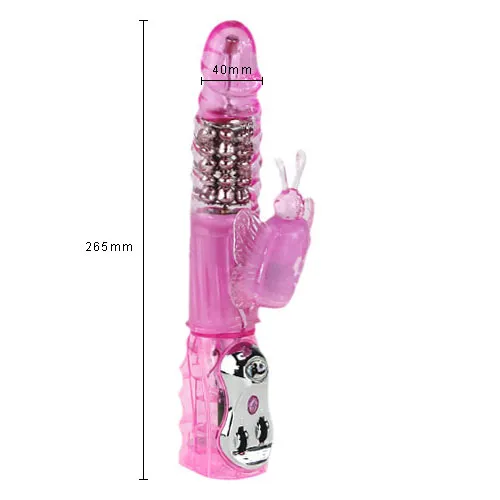 Водонепроницаемый вибромассажер с функцией вращения ствола и мощным клиторальным стимулятором в форме бабочки. Cкорость вибрации и скорость ротации регулируются с помощью отдельных колесиков, расположенных на ручке игрушки. Вращение осуществляется при помощи металлических шариков, расположенных внутри. Мягкий, имеет не пористую структуру . Материал изготовления-ПВХ ( гель) и пластик АВС. Работает от четырех батареек типа АА ( нет в комплекте). Общая длина: 26 см. Рабочая длина: 12 см, максимальный диаметр 3,5 см, длина стимулятора 7,5 см, диаметр 3 см. Упаковка прозрачная коробка с принтом.