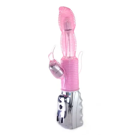 Хай-тек с вращающейся головкой розового цвета с клиторальным и анальным стимуляторами. Имеет 7 режимов вибрациии и 7 режимов вращения. Данные режимы можно совмещать. Мягкий, имеет ребристую рабочую поверхность. Материал изготовления- ТРЕ ( гель). Работает от 4-х батареек типа АА (нет в комплекте). Общая длина 25,5 см, рабочая длина 13 см, максимальный диаметр 3,5 см, длина клиторального стимулятора 5 см, диаметр 2 см, длина анального стимулятора 4 см, диаметр 1 см. Упаковка- прозрачный пластик.