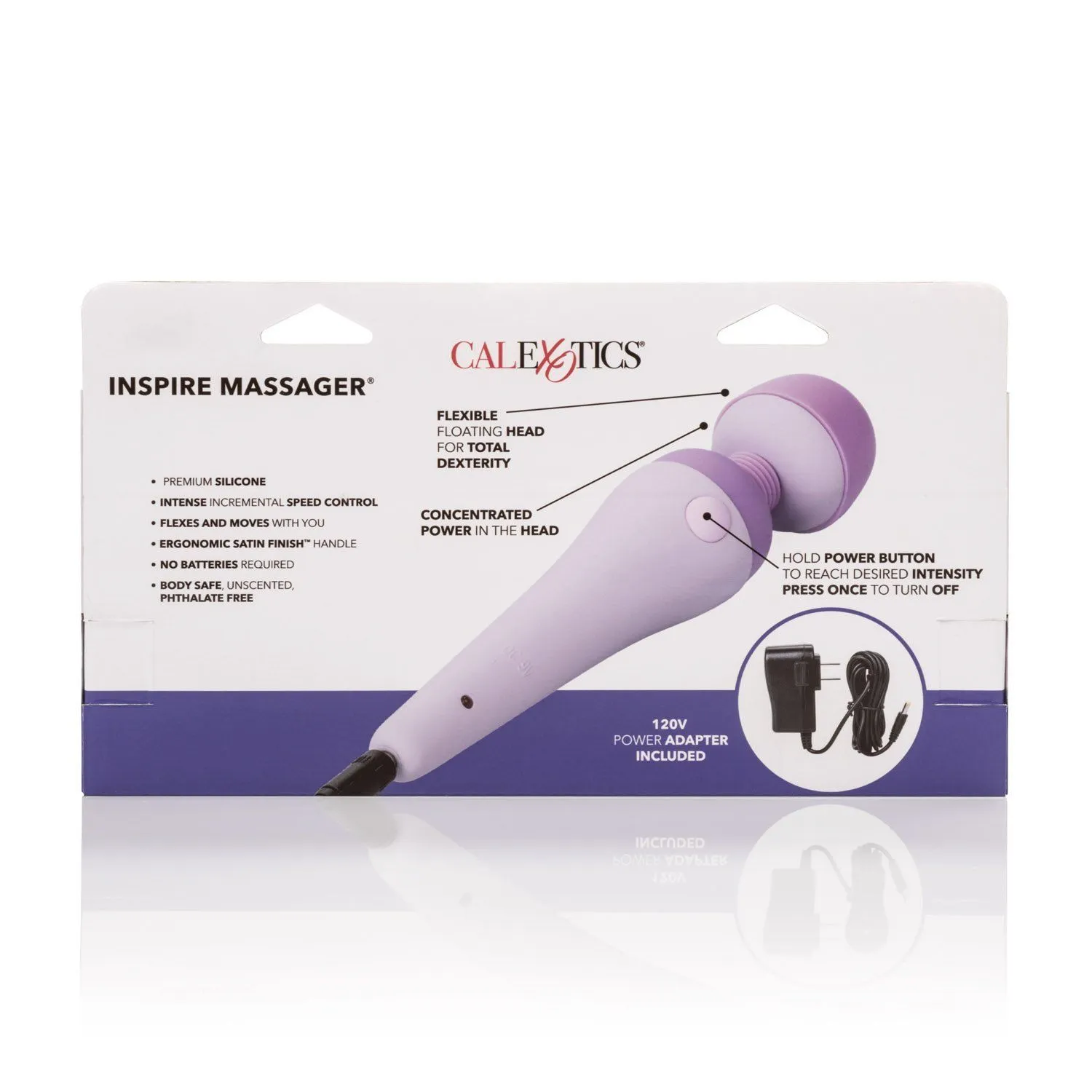 Inspire Massager выполнен из прочного пластика, а его головка - из качественного и нежного силикона. Для того чтобы повысить скорость вибрации, надо удерживать кнопку на корпусе. Inspire Massager работает от сети, в комплекте есть адаптер питания 100/240 вольт.