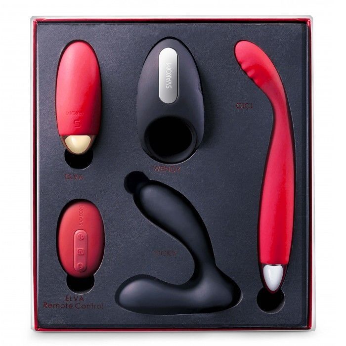 Набор Gift Box for Lovers от компании Svakom состоит из интимных 4 игрушек: вибратора для точки G Cici, виброяйца на ду Elva, эрекционного виброкольца Wendy и стимулятора простаты Vicky. Этот набор включает в себя все необходимое для проведения с партнером ночи, полной любви и страсти.