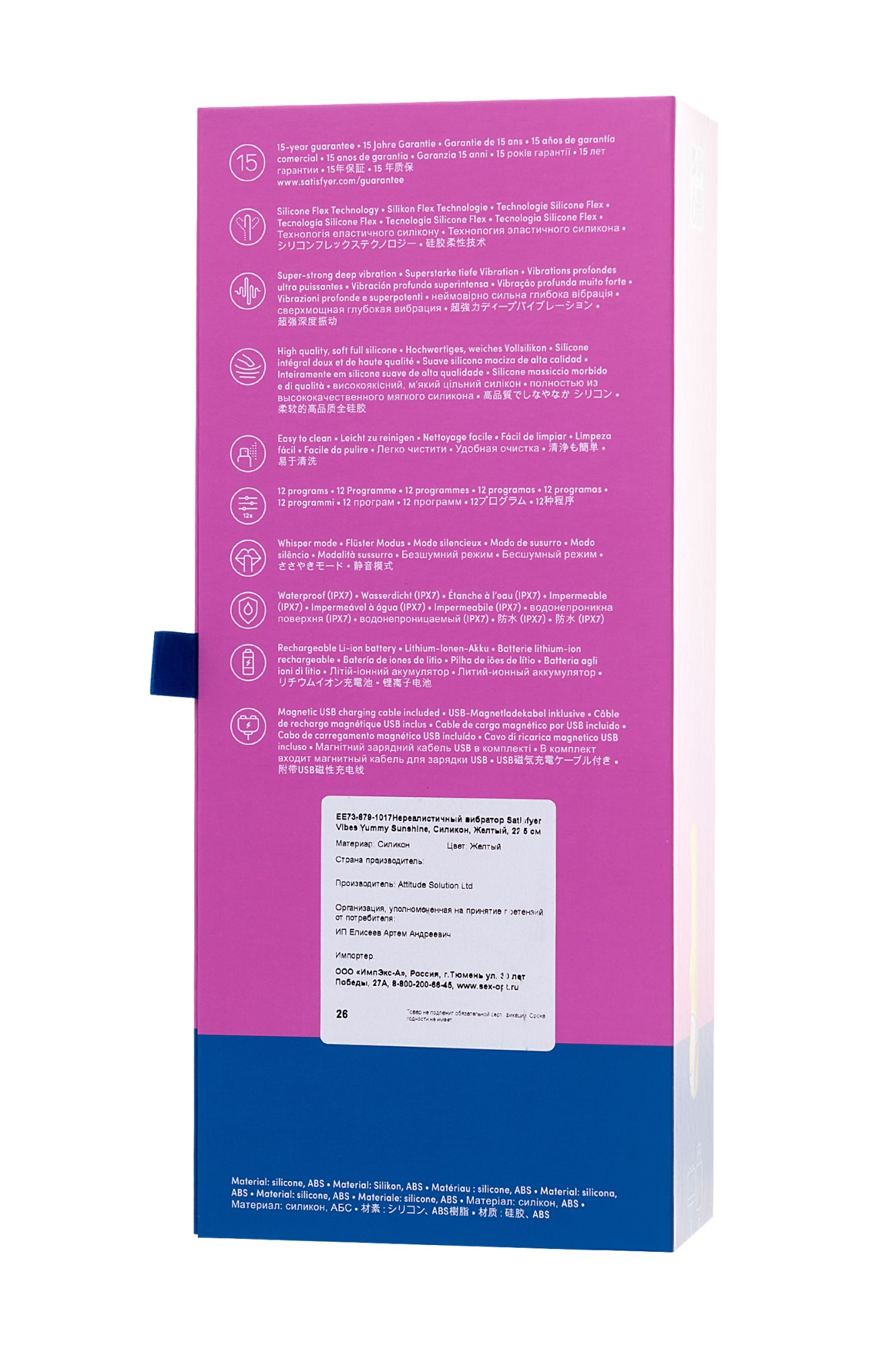 Озорной цвет, дразнящие воображение рельефы, гибкий ствол, 2 мощных мотора и яркая способность безукоризненно стимулировать точку G — нереалистичный вибратор Satisfyer Vibes Yummy Sunshine поднимает настроение и заставляет сиять ваше солнце. Давайте посмотрим, как он это делает. Плавно изогнутая головка и гибкий ствол соблазнительно массируют точку G и повышают градус возбуждения до рекордных отметок. Широкое основание ствола с ощутимым выступом уделяет должное внимание входу во влагалище, усиливая ваше наслаждение. Рельефные волны на стволе дополнительно прорабатывают чувствительные зоны. Шелковистый на ощупь силикон мощно и объемно передает 12 программ головокружительной вибрации, чтобы вы смогли прочувствовать каждый оттенок интимной игры — от игривой прелюдии до энергичной разрядки. 2 мотора идеально точно распределяют сильную вибрацию по всей длине игрушки, помогая датчикам удовольствия зашкаливать от накатывающих эмоций. Полная водонепроницаемость позволяет вибратору сиять для вас не только в спальне, но и в бодрящем душе или расслабляющей ванне. Эргономичная ручка-кольцо со встроенной панелью гарантирует комфортное управление легким нажатием кнопки. Satisfyer Vibes Yummy Sunshine — пусть ярче светит солнце!