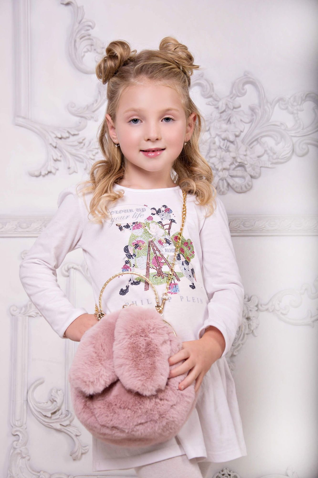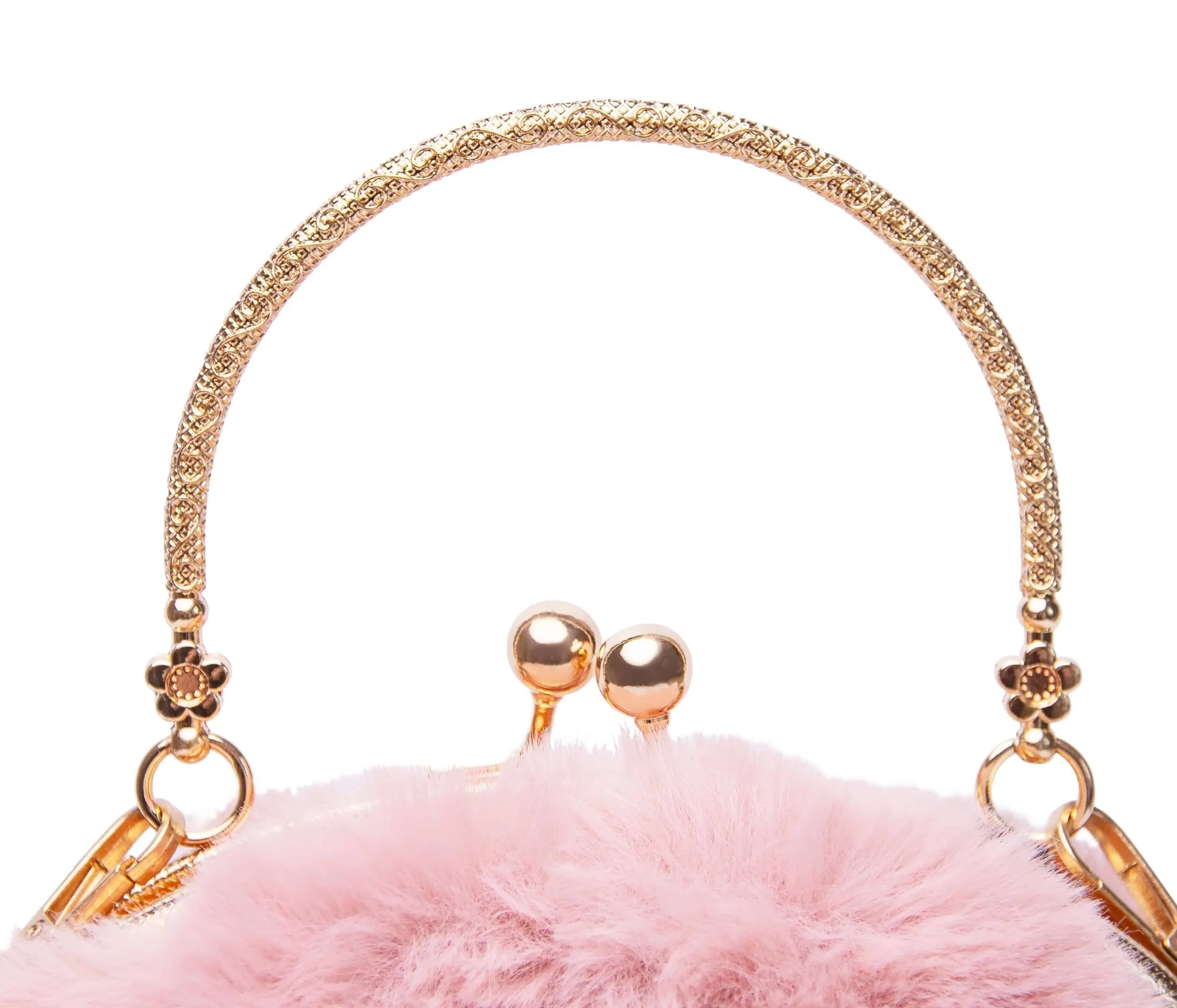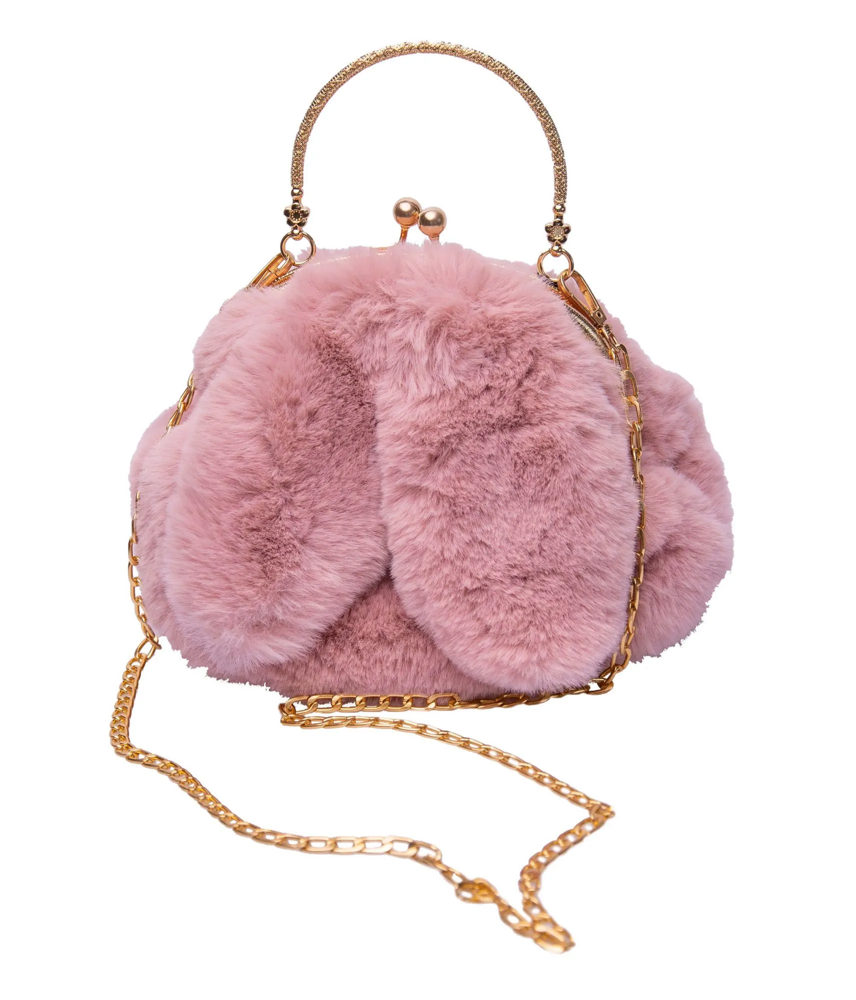 Пушистая розовая круглая сумка с ушками на золотой цепочке.