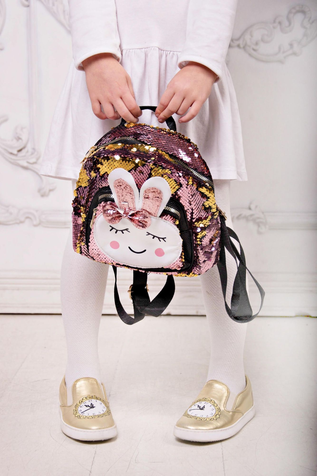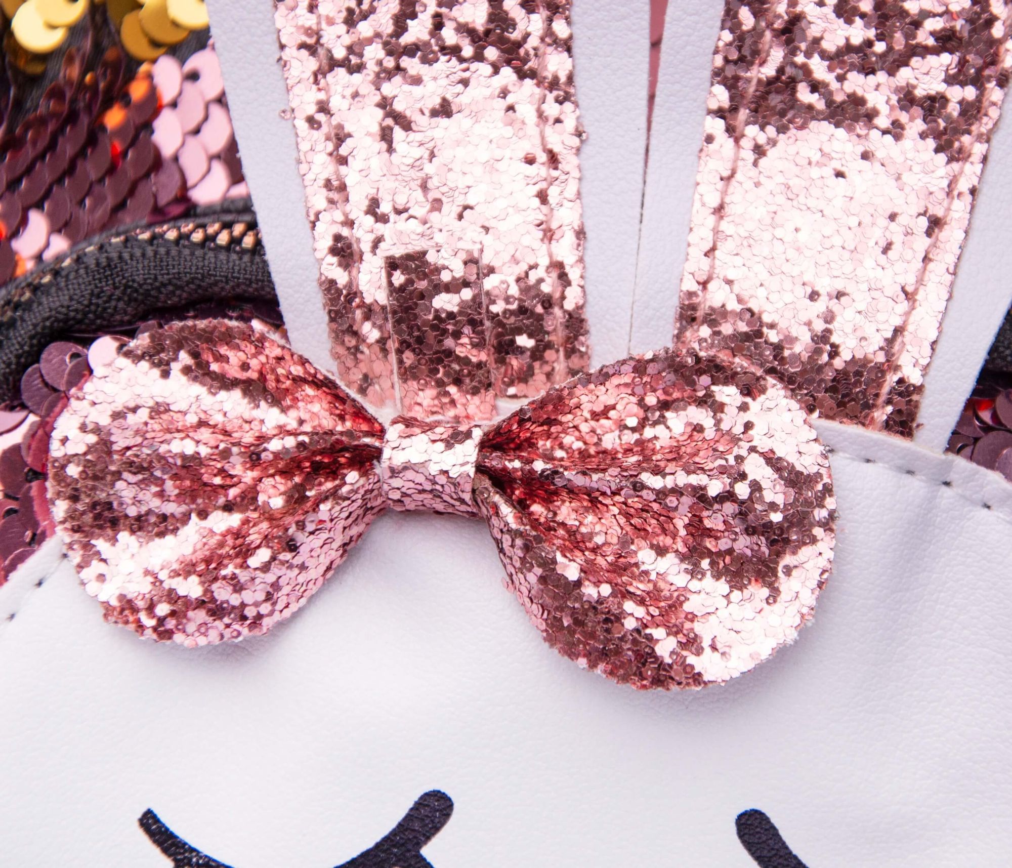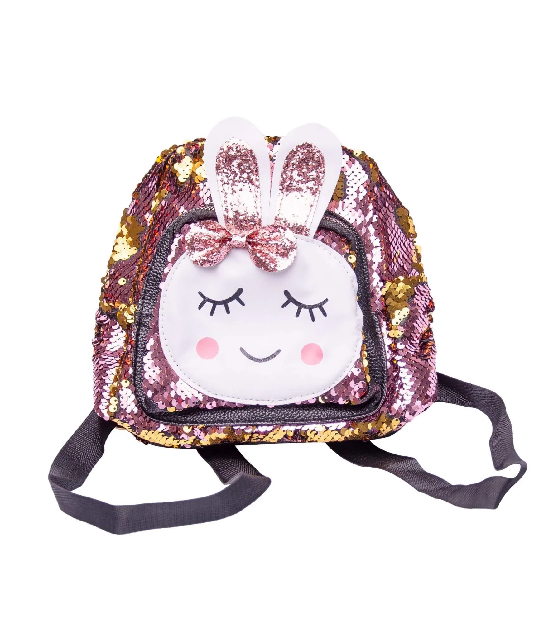 • с лицевой стороны рюкзак украшен мордочкой и блестящими ушками зайца со сверкающим бантиком