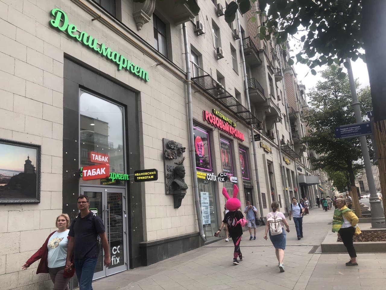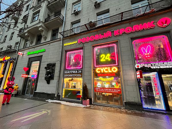 Выход на Тверскую улицу в сторону центра. По правой стороне почти в конце здания Вы найдете гипермаркет Розовый Кролик.